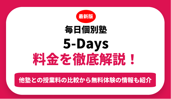 毎日個別塾 5-Daysの料金を授業料と入会金と月謝など年間にかかる費用も含めて解説します。他の個別指導塾の料金とも比較しながら毎日個別塾 5-Daysの料金は高いのか安いのかについても解説します。毎日個別塾 5-Daysの料金や費用を正しく知った上で入塾を検討したいという方はぜひ参考にしてみてください。