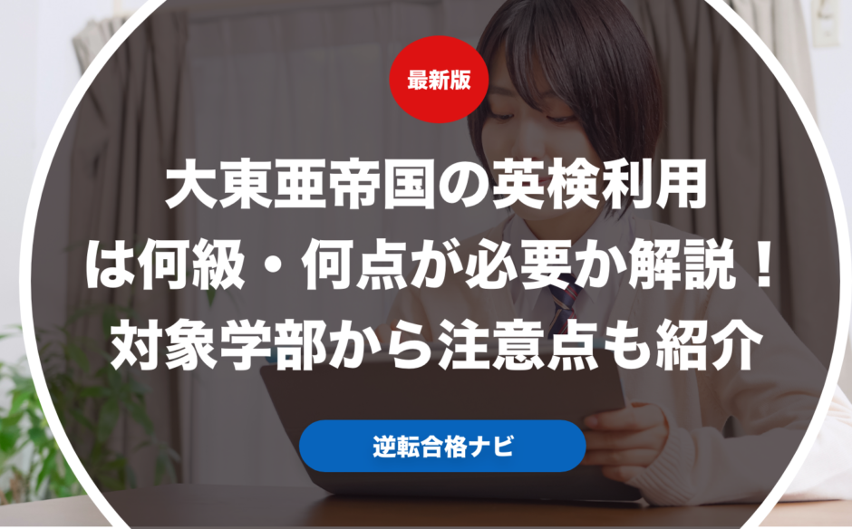大東亜帝国の英検利用は何級・何点が必要なのか具体的に解説します。また実際に大東亜帝国で英検利用ができる学部からそれぞれの英検利用で合格するための注意点も紹介します。さらに実際に大東亜帝国志望の受験生や保護者向けに英検利用の優遇措置やおすすめの受験戦略についても合わせて解説します。