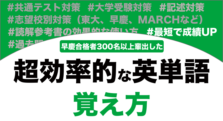 これまで個別指導塾の塾長として早慶に現役生および浪人生を含めて合計で300人以上の合格者を輩出してきただけでなく英検準一級合格者を1200名以上輩出してきました。その中で共通テストで9割以上を取った生徒もたくさんおり、実際に指導する中で一気に英単語力が上がった生徒を輩出してきた超効率的な英単語の覚え方を解説したいと思います。