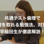 共通テスト対策の倫理政経のおすすめの勉強法を徹底解説します。今回は、独学で倫理政経を勉強する上で大切なこととおすすめの参考書、共通テストで9割取れる倫理政経の勉強法を倫理政経を選択して独学で早稲田大学に合格した先輩が詳しく紹介します。