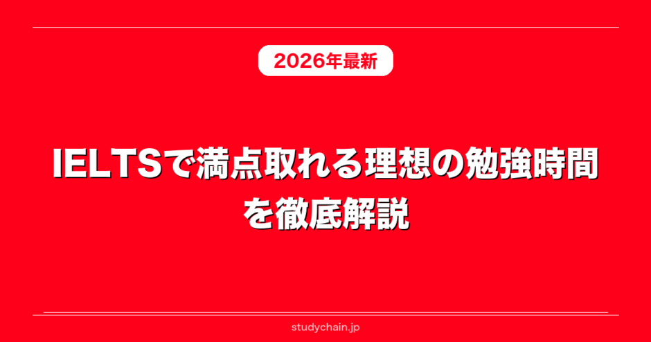 IELTSで満点(バンドスコア9.0)を達成するために必要な総勉強時間は、英語力がほぼゼロの状態から始める場合、1750時間以上が目安となります。 1日3時間の学習を毎日続けた場合、約1年8ヶ月から2年ほどかかる計算です。 ただし、もともと英語力がある人や、留学経験がある人はこの限りではなく、現在のスコアが高いほど必要な勉強時間は大幅に短縮されます。 IELTSで満点を目指す際に重要なのは、勉強時間の確保だけでなく、勉強の質を高めることです。 単語・リスニング・ライティング・リーディング・スピーキングの5領域をバランスよく対策することが、満点への近道となります。 まず現在の自分のスコアを把握したうえで、必要な勉強時間を逆算して学習計画を立てるようにしましょう。初心者でもIELTSで満点取れる理想の勉強時間