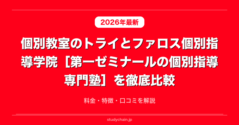 個別教室のトライとファロス個別指導学院[第一ゼミナールの個別指導専門塾]を料金や口コミや指導体制や指導方針など項目ごとに徹底解説します。個別教室のトライとファロス個別指導学院[第一ゼミナールの個別指導専門塾]を検討している方に向けてそれぞれどういう方におすすめなのかや個別教室のトライとファロス個別指導学院[第一ゼミナールの個別指導専門塾]の違いやメリットやデメリットについてもそれぞれ解説します。個別教室のトライとファロス個別指導学院[第一ゼミナールの個別指導専門塾]の良い口コミと悪い口コミも比較しながら紹介するのでぜひ実際の声も含めて参考にしてみてください。