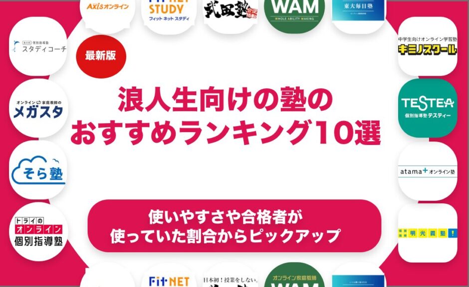 浪人生向けの塾をおすすめのランキング形式で10個紹介します。浪人生向けの塾を探している方におすすめの選び方や選ぶ上でのポイントも合わせて解説します。浪人生向けの塾を料金や特徴で比較しながら解説します。浪人生向けの塾の中でも自分に合ったものを見つけたいという方はぜひ参考にしてみてください。
