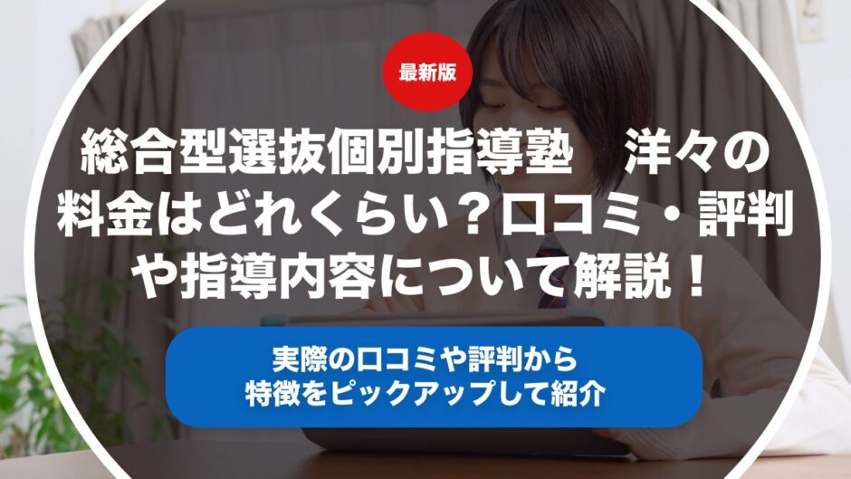総合型選抜個別指導塾 洋々の料金について入会金や月謝や授業料や教材費用についてそれぞれ解説します。また実際の口コミや評判をもとに総合型選抜個別指導塾 洋々の指導内容の特徴やどんな人におすすめの塾なのかどうか具体的に解説します。総合型選抜個別指導塾 洋々の入塾を検討しているという方はぜひ参考にしてみてください。